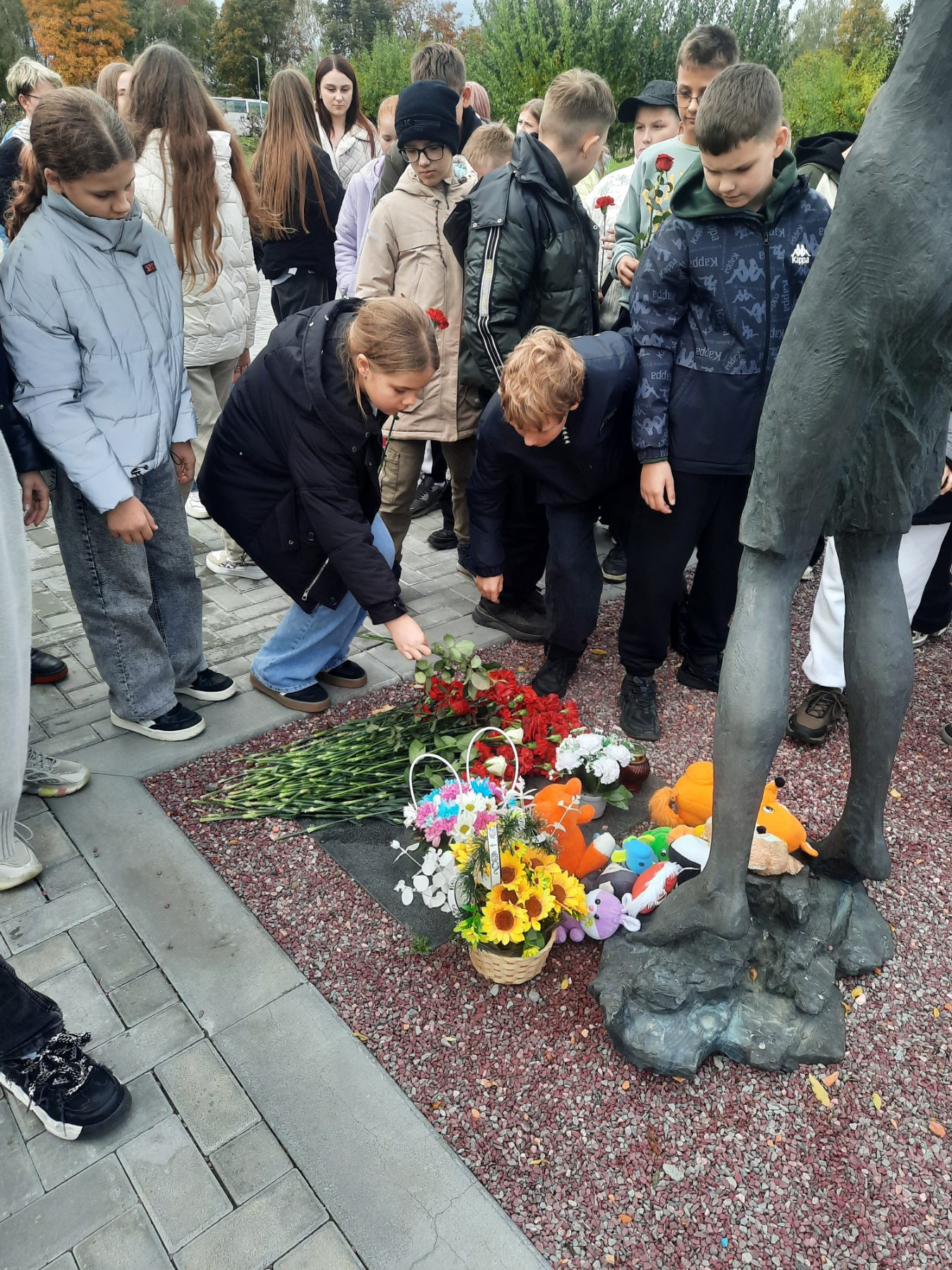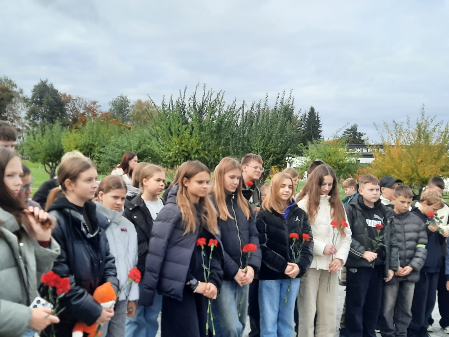 В знак вечной памяти и скорби о детях, чьи судьбы оборвала война, мы объявили минуту молчания и возложили цветы к подножию монумента.