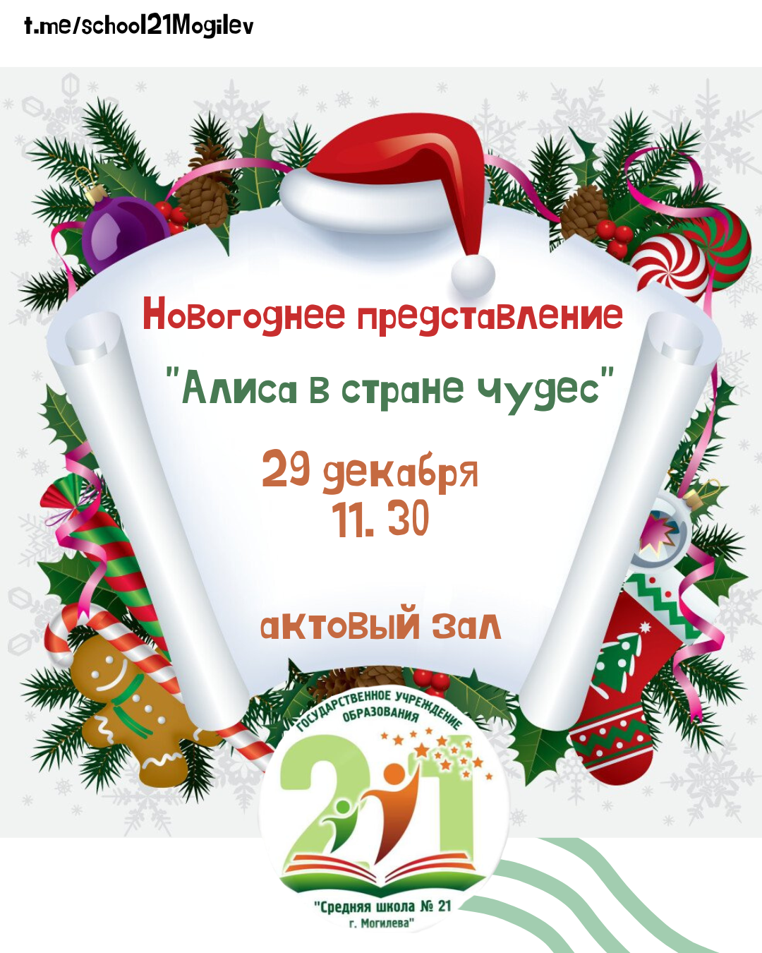 Государственное учреждение образования «Средняя школа № 21 г. Могилева» приглашает учащихся и их родителей на праздничное новогоднее представление!