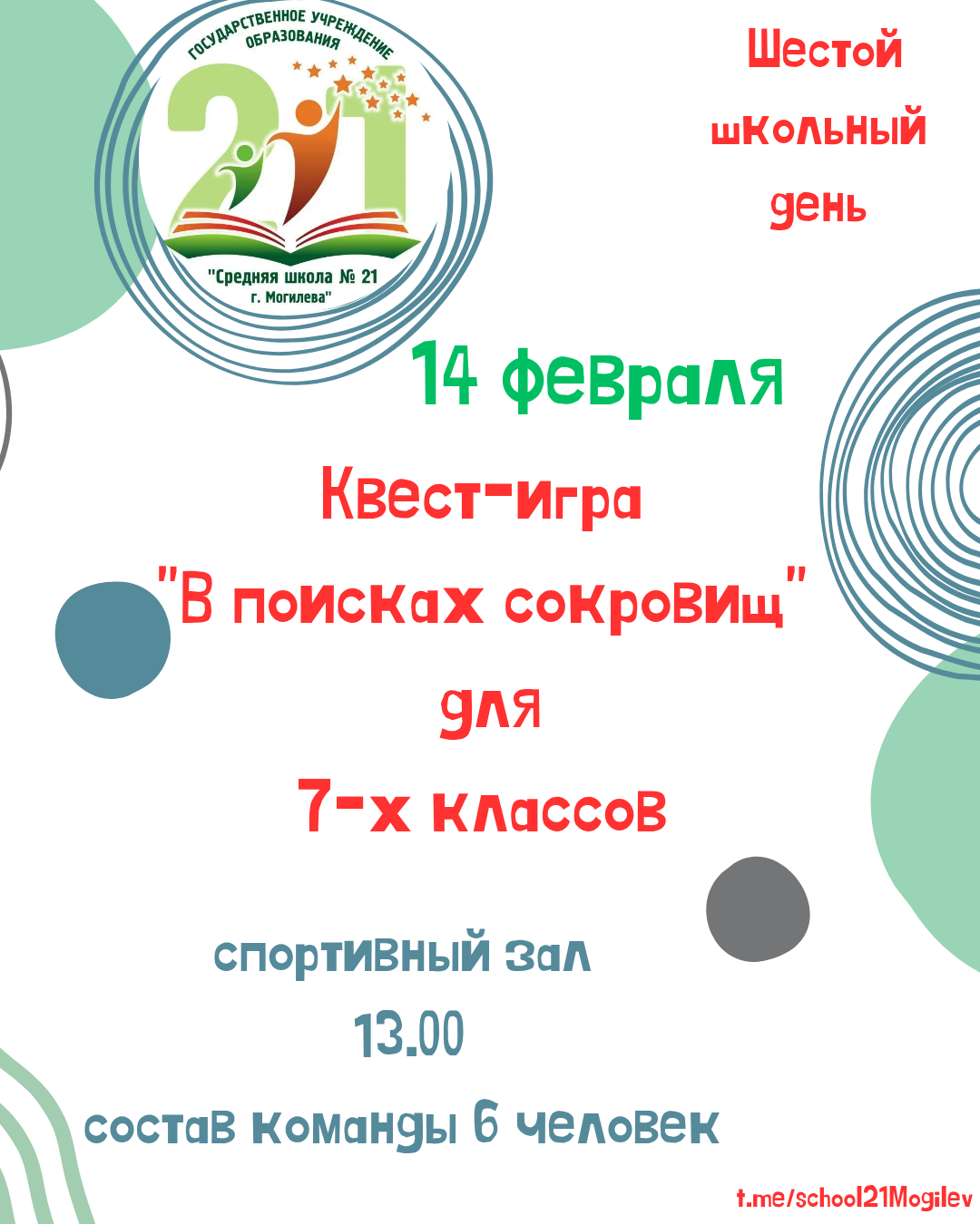 Учащиеся 7-х классов, внимание! В пятницу, 14 февраля, в спортивном зале состоится увлекательная квест-игра «В поисках сокровищ».