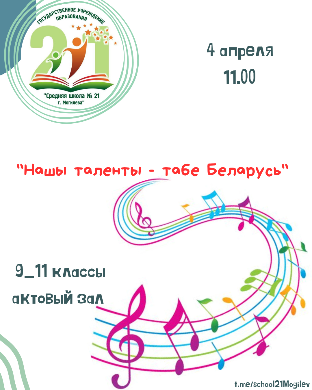 4 апреля в 11:00 в актовом зале средней школы № 21 г. Могилева состоится мероприятие «Нашы таленты — табе, Беларусь».