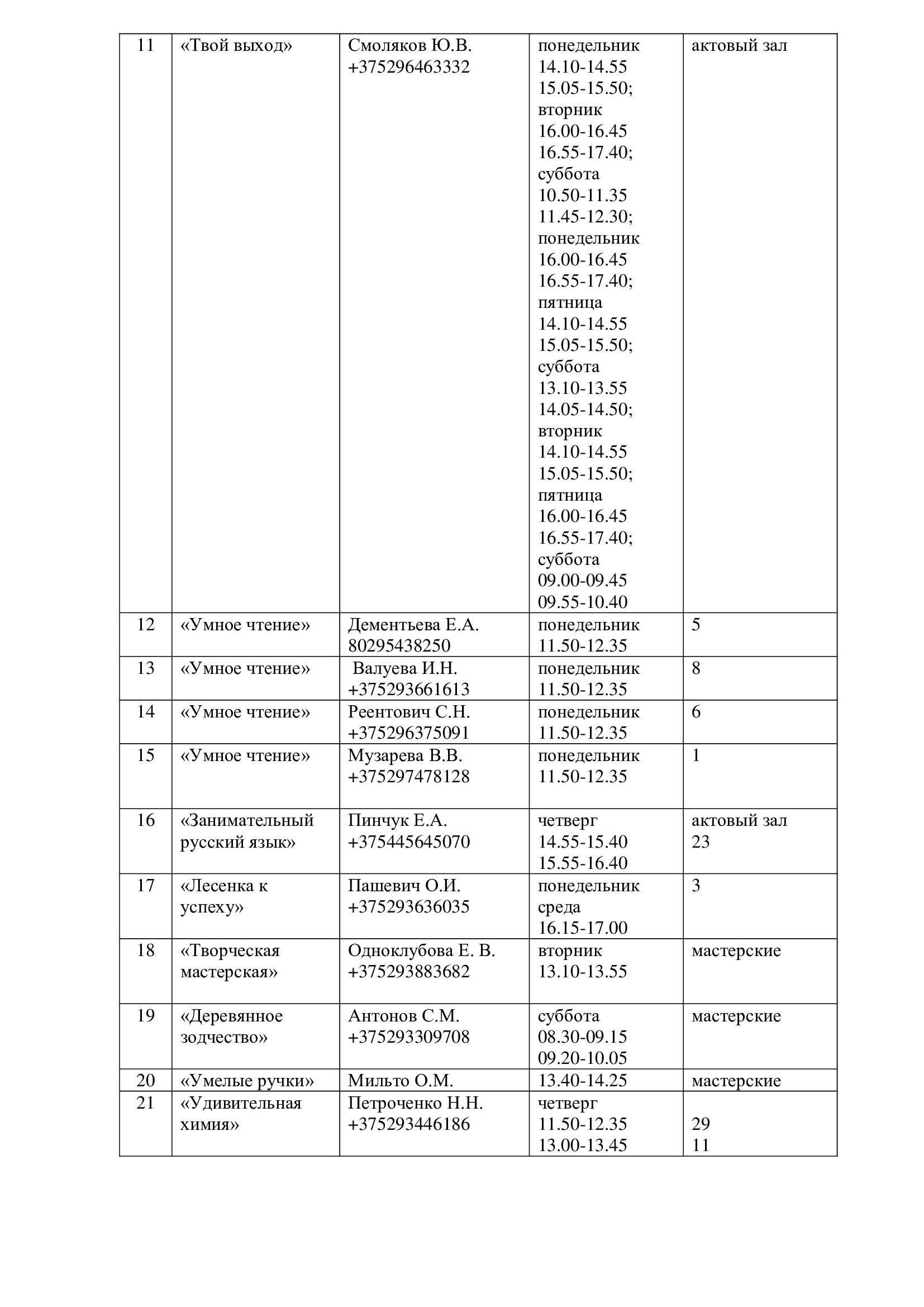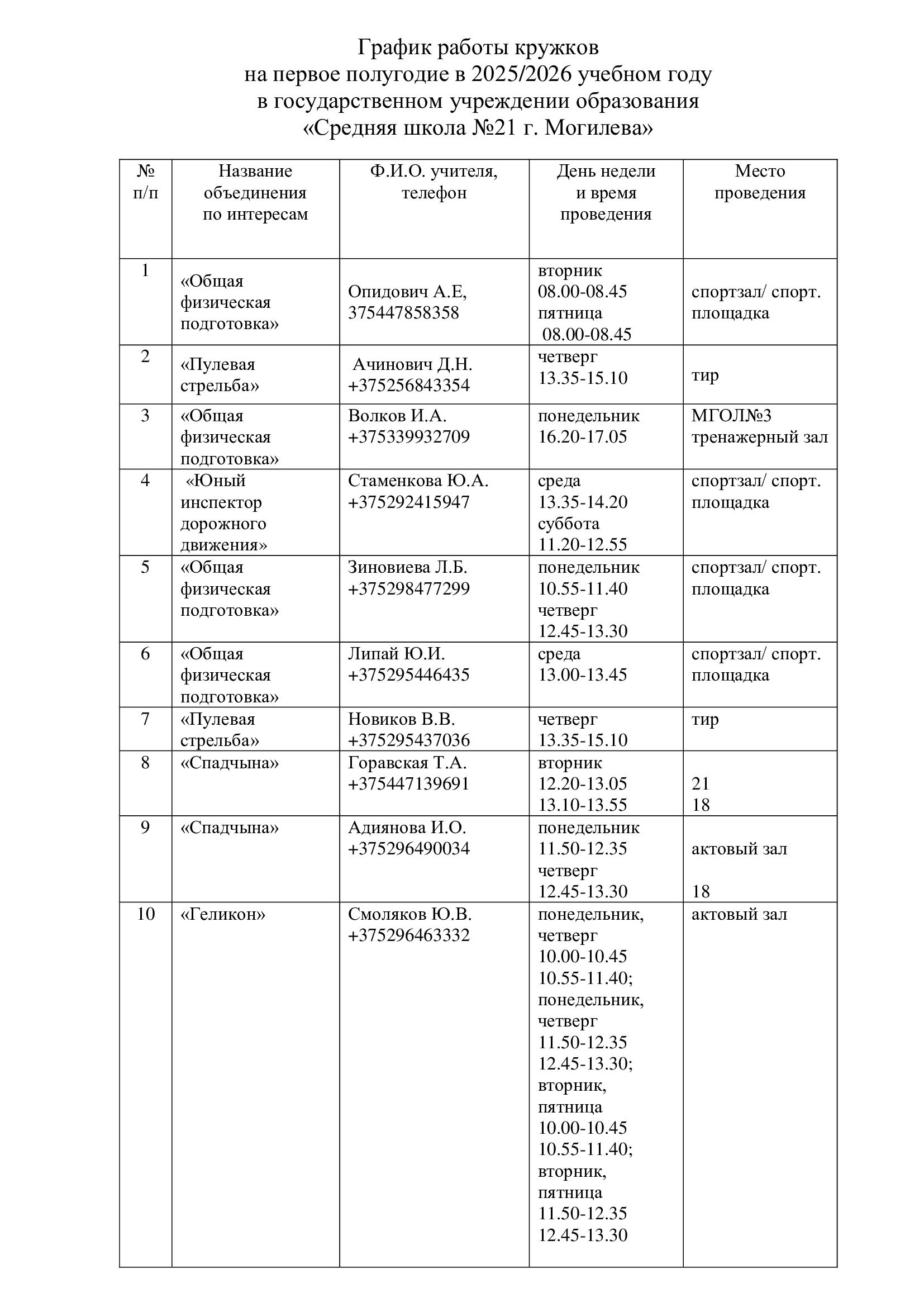 ГРАФИК РАБОТЫ КРУЖКОВ